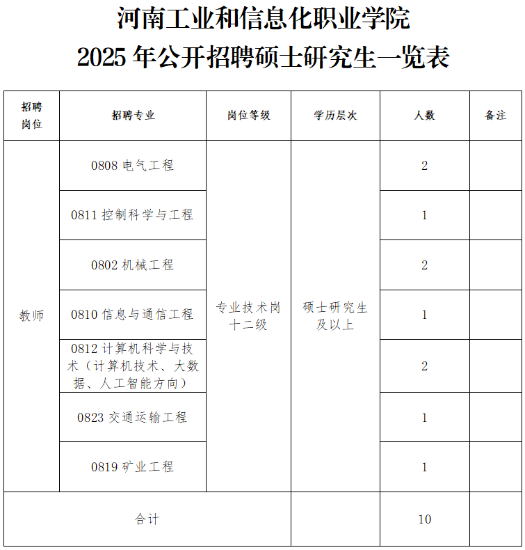 按照《事业单元人事办理条例》《河南省事业单元公开聘请工做规程》(豫人社〔2015〕55号)相关,连系工做现实,河南工业和消息化职业学院拟面向社会公开聘请工做人员10名。河南工业和消息化职业学院是由省教育厅从管的一所公办全日制专科条理通俗高档院校。学校建立于1975年,创办无机械制制取从动化、机电一体化手艺、电气从动化手艺、城市轨道交通运营办理、无人机使用手艺、计较机使用手艺、挪动通信手艺、大数据手艺取使用、物联网使用手艺、电子商务、会计、建建工程手艺、工程制价等48个高职专业及标的目的,环绕工业和消息化正正在扶植资本取平安、配备制制、土木建建、电子消息、财经商贸等五大专业群。学校近年来被评定为河南省优良高档职业院校,入选河南省“现代学徒制试点学校”,同时是河南省职业院校师资培育培训示范和高技强人才培育示范,河南省电子商务职业教育实训,河南省煤炭行业职业教育校企合做指点委员会常务副从任单元、秘书长单元等。学校还荣获全国煤炭系统文明单元、省级文明校园、河南省职业教育攻坚工做先辈单元、全省学校行风扶植先辈单元、河南省职业指点取就业办事先辈单元。成立以校带领为组长,由组织人事部牵头,党政办公室、纪检监察处、教务处、资本保障核心、武拆部等相关部分担任报酬的聘请工做带领小组。带领小组下设办公室,由组织人事部担任人兼任办公室从任,具体担任聘请的组织、协调等工做。(2)已取得研究生学历、硕士及以上学位。正在国(境)外高校取得学历学位者,须供给教育部留学办事核心出具的国(境)外学历学位认证证书。1。 现役甲士、试用期内的机关事业单元工做人员、未满最低办事年限的机关事业单元工做人员;3。 被中国的人员、被的人员,以及尚未解除党纪、政务处分或正正在接管规律审查、监察查询拜访的人员;4。 曾正在公事员招录、事业单元公开聘请测验中被认定有舞弊等严沉违反聘请规律行为还正在禁考期的;6。 招聘人员不得报考聘用后即形成回避关系的聘请岗亭。回避关系包罗《事业单元人事办理回避》第六条和《河南省事业单元公开聘请工做规程》第五十五条所列景象;7。 国度和省还有不得招聘到事业单元的人员。聘请范畴和前提严酷按照《河南省事业单元公开聘请工做规程》施行。2025年拟公开聘请优良硕士结业生10名,聘请专业及打算见附件《河南工业和消息化职业学院2025年公开聘请硕士研究生一览表》